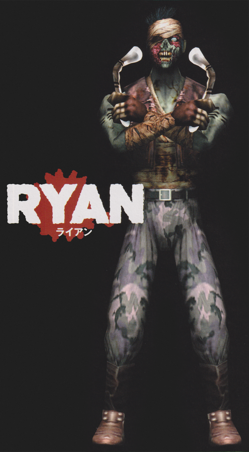 Ryan: A bandaged Zombie in a brown-red vest who throws two golden shuttel-like blades at once at you. HP:150